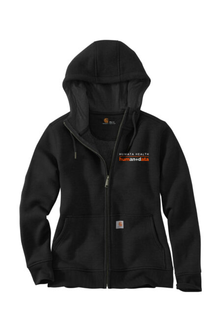 $62.00The Women’s Carhartt® Clarksburg Full-Zip Hoodie combines the softness of a sweatshirt with the warmth and durability of a jacket. Made from a 55/45 cotton/poly blend, it features an attached three-piece hood with drawcord closure, a full-length brass zipper, and two front hand warmer pockets. Stretchable, spandex-reinforced rib knit cuffs and waistband ensure comfort and shape retention, while the Carhartt label is sewn on the left pocket as a mark of quality. For a personalized finish, the hoodie is decorated with the HUMATA EMB logo on the left chest.